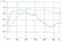 Kurve 1: Paneeltyp K-84, unperforiert, Modul 100 mm, Fugenbreite 16 mm, mit Mineralwollplatten 20 mm dick, Deckenhohlraum 20 cm.