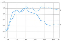Kurve 1: Paneeltyp K-134, unperforiert, Modul 150 mm, Fugenbreite 16 mm, mit Mineralwollplatten 20 mm dick, Deckenhohlraum 20 cm.