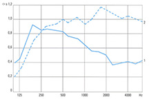 Kurve 1: Paneeltyp K-84, unperforiert, Modul 100 mm, Fugenbreite 16 mm, mit Mineralwollplatten 20 mm dick, Deckenhohlraum 20 cm.